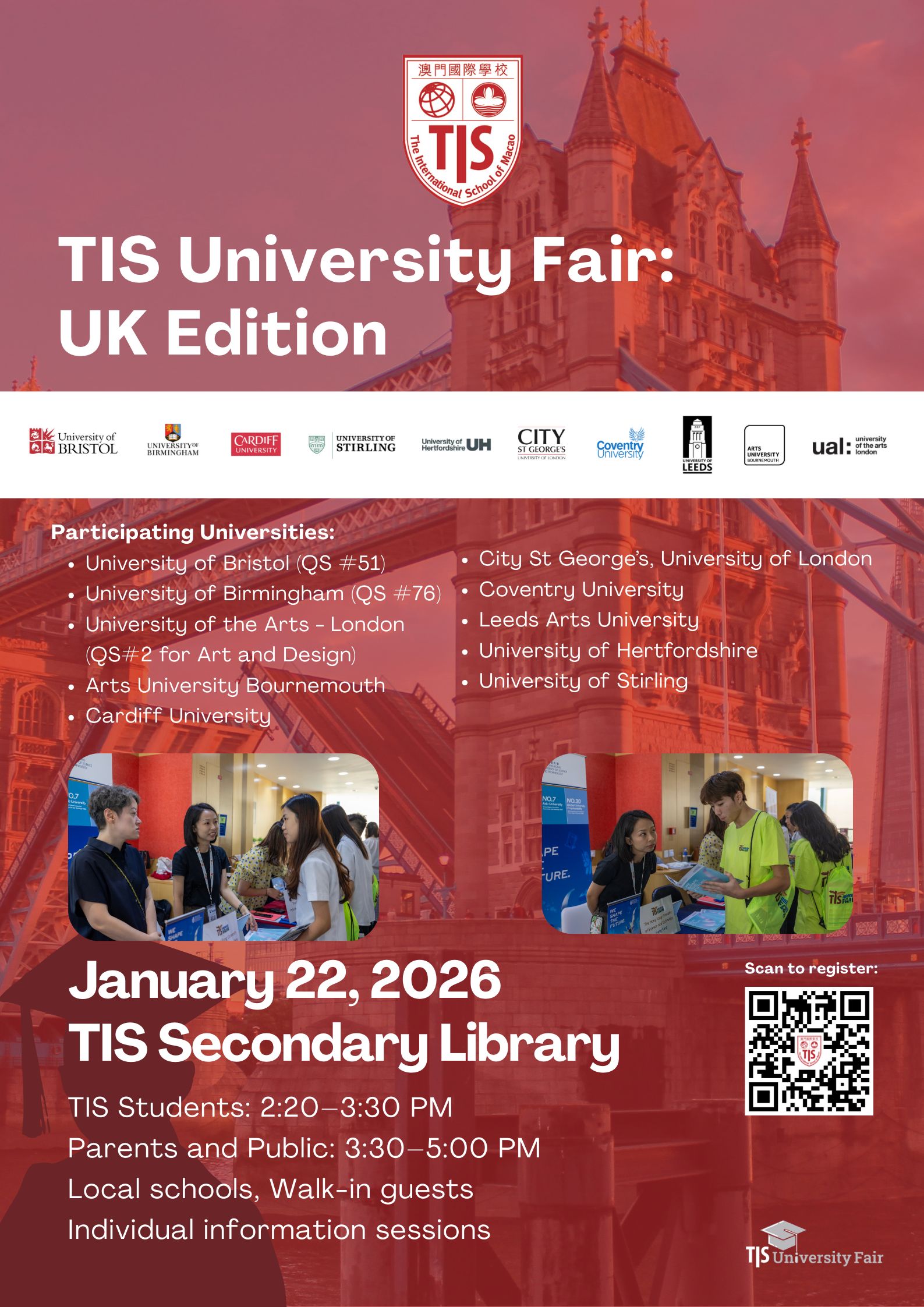 Mark your calendars for our upcoming TIS University Fair - UK edition, featuring the University of Bristol (QS#51), University of Birmingham (QS#76), University of the Arts - London (UAL) (QS WUR #2), and seven other esteemed institutions from the United Kingdom!